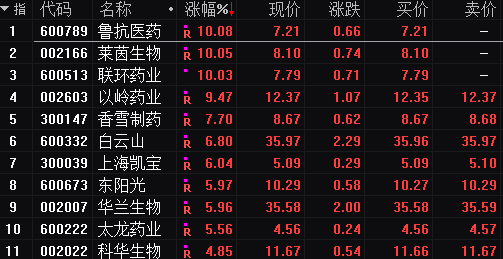 个股方面,鲁抗医药、莱茵生物、四环生物拉升涨停,联环药业、白云山、山大华特、尔康制药、药石科技跟涨。