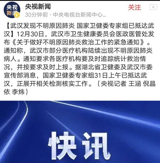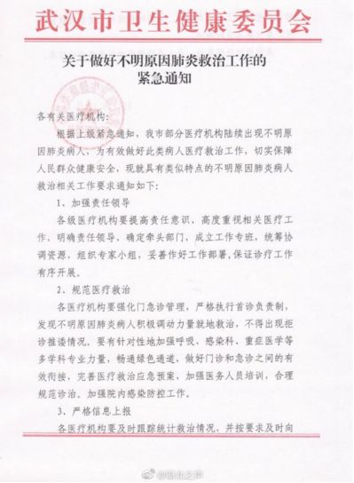 据央视报道,12月30日,武汉市卫生健康委员会医政医管处发布《关于做好不明原因肺炎救治工作的紧急通知》。