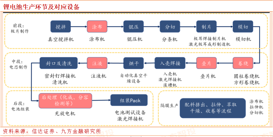前段设备包括搅拌机、涂布机、辊压机和分切机等,产值占比约为35%,其中涂布机价值最大,占75%左右,其次是辊压机;中段设备包括卷绕机、叠片机、注液机等,产值占比约30%,其中卷绕机价值占比 70%;后段处理需要分容化成柜和检测等设备,产值占比约35%,其中化成和分容占 70%,组装占 30%。