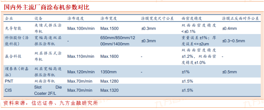 2) 涂布设备(转移式涂布机和挤压式涂布机)国内龙头供应商:先导智能、赢合科技、科恒股份和璞泰来;