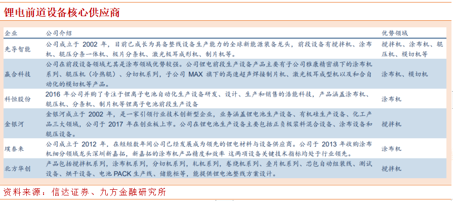 前段核心设备供应商为先导智能、赢合科技、科恒股份、金银河、北方华创、璞泰来。具体来看,