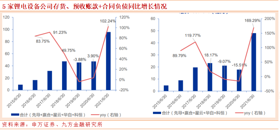 从资产负债表看,上半年5家锂电设备公司存货同比增长102.24%,预收账款+合同负债同比增长169.29%,两个前瞻指标高增一方面显示出当前高度景气,同时也是行业未来业绩的映射。