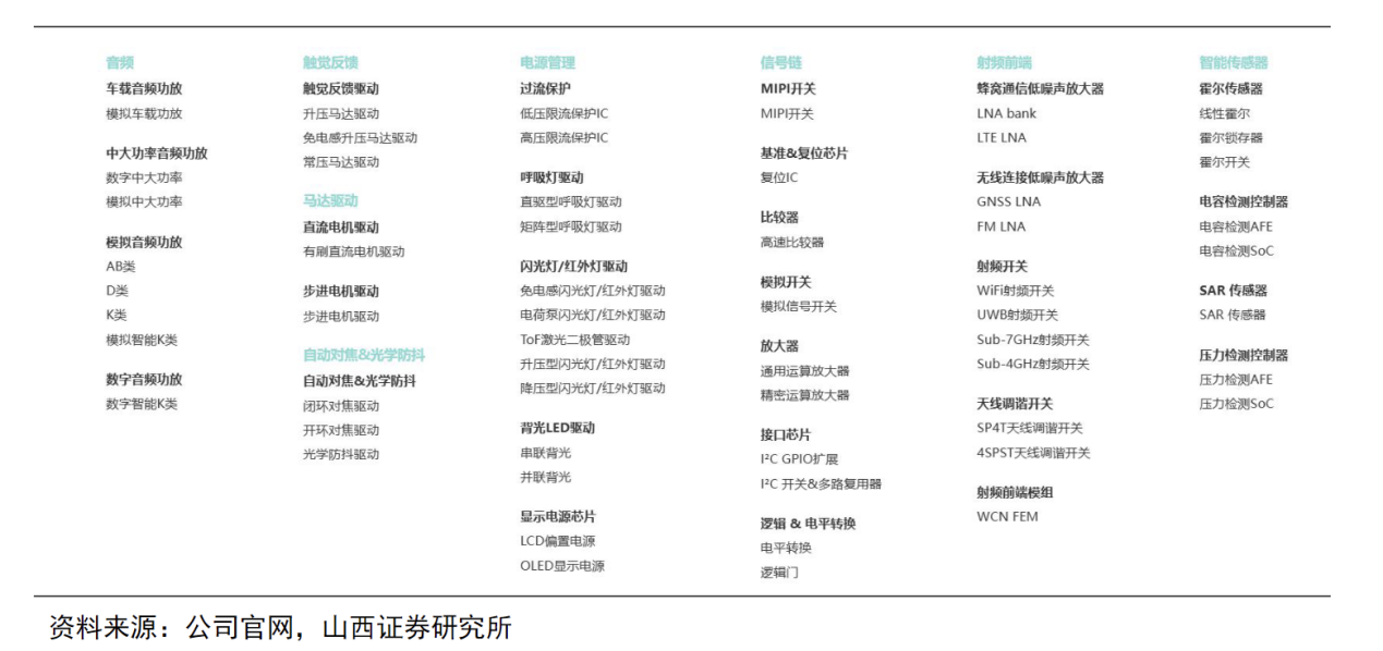 产品线广度:公司是国内产品线最齐全的平台型模拟芯片公司之一,拥有40多个产品子类,近2000款产品型号,覆盖声、光、电、射、手五大领域,能够为客户提供更全面的解决方案。