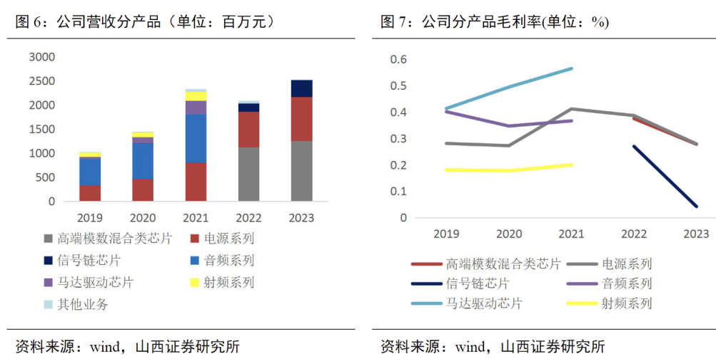 公司主要营收来自高端模数混合芯片、电源类芯片以及信号链芯片,下游主要覆盖消费电子、AIoT、工业、汽车等领域。公司核心产品高端模数混合芯片,在领域内形成了丰富的技术和客户资源积累,具备硬件芯片和软件算法一体化的音频解决方案、Haptic 硬件+TikTap 触觉反馈系统等多个子品类解决方案,在电源管理和信号链芯片领域也持续扩充产品线,积极开拓新的下游应用。