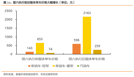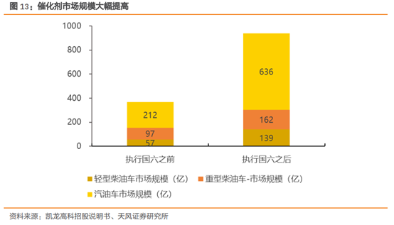 天风证券测算轻型柴油车、重型柴油车和汽油车在执行国六标准前每套载体单价平均价值增幅将达到265%,催化剂覆涂单价平均增幅将达到105.72%,对应市场空间分别将达到93亿和938亿,相对于原有市场容量增长240%和156%。
