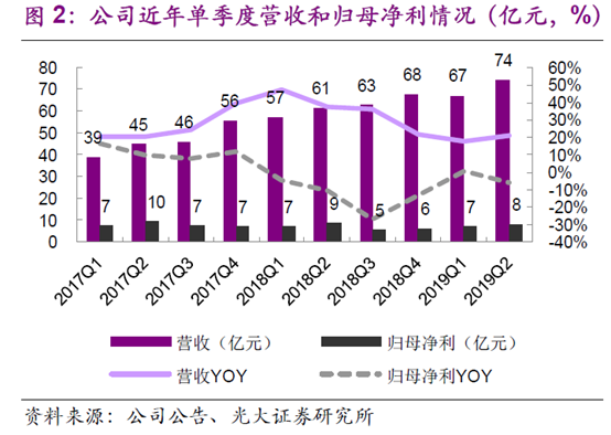 公司2019年三季度收入212.28亿元,同比增长17.01%,单季度收入70.55亿,同比增长12.28%,环比下降5.21%。