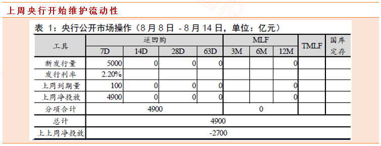 资金流动性合理充裕。上两周银行体系流动性合理充裕,央行开展7天期公开市场逆回购操作5000亿元,利率与此前持平,为2.2%。此外,上周有100亿元逆回购到期,央行合计净投放资金4900亿元。同时,央行公告称将于8月17日对本月到期的两笔中期借贷便利(MLF)一次性续做,具体操作金额将根据市场需求等情况确定。
