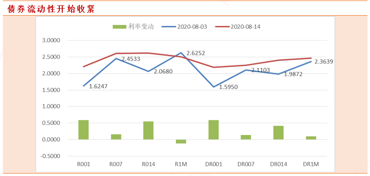 点评:上周7月金融数据及经济数据公布,债市收益率整体有所下行。 金融数据方面,7月数据整体不及预期。7月新增人民币贷款9927亿元,市场预期1.18亿元,同比少增631亿元。在严查违规套利背景下,叠加前期疫情应急相关信贷支持逐渐退出,票据融资和短期贷款继续回落。7月M2同比增速由上月的11.1%降至10.7%,M2增速小幅下降主要是由于信贷投放有所放缓。从存款结构来看,股市异常火爆的背景下,居民存款“搬家”至非银存款的现象较为明显。整体而言,狭义流动性的收紧已经开始向广义流动性传导,其对经济基本面将构成一定的抑制,使得经济回升斜率变慢,叠加美国大选前中美摩擦持续升级预期,市场风险偏好应当回落,利好债券市场。