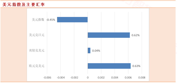 美元指数小幅下行。上周美元指数小幅下行,周五较前周下跌0.34%;非美货币多数上行,其中欧元兑美元升值0.42%;日元贬值0.65%;英镑兑美元升值0.26%;澳元兑美元升值0.20%。