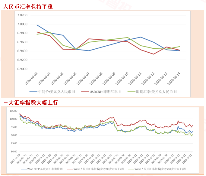 点评:上周美元指数延续弱势格局,连续第八周收跌,相对疲软的基本面是拖累美元的重要因素。共和党和民主党未能就第二轮刺激达成一致,后续遇上国会休会假期,财政刺激落地期望落空。美国11月大选前“战火”反而越烧越旺,这些令美元严重承压。反观欧洲,情况明显不同。疫情控制相对得力,经济指标处于复苏通道当中,欧洲央行也加大了量化宽松政策力度。在此背景下,越来越多的资金正流入欧元以及欧元支持的资产。虽然上周初请失业金人数有所改善,核心零售也好于预期,但市场仍在押注美联储将继续扩大刺激,因此继续加大美元的空头持仓。人民币方面,随着美元指数的下行,近期人民币汇率持续走强。此外,上周传出美国和中国已同意在8月15日举行高级别会谈,以评估北京是否遵守了中美今年早些时候签署的第一阶段贸易协议,这也对人民币汇率形成支撑。14日央行发布《人民币国际化报告2020》,2019年人民币跨境使用逆势快速增长,全年银行代客人民币跨境收付金额创历史新高。人民币跨境收付占同期本外币跨境收付总金额的比重为38.1%,同样创历史新高。这充分表明人民币资产对境外投资者具有较强吸引力,也体现了全球投资者对中国经济的信心。