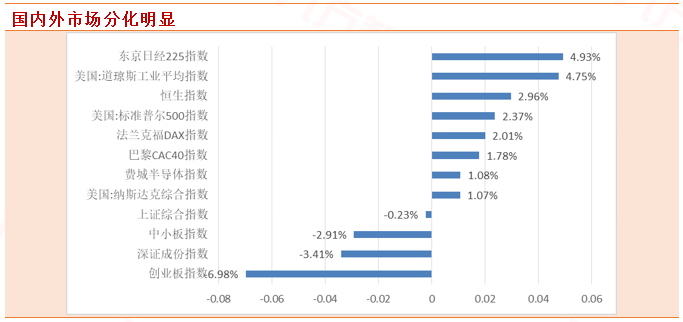 国内市场指数普遍回落:上周主要指数出现高开震荡回落走势,中证1000表现居首。上证综指、上证50、中小板指、创业板指、中证500、中证1000、万得全A、深证成指、沪深300等主要指数分别变动0.18%、0.76%、-0.78%、-2.95%、-0.98%、-2.12%、-0.66%、-1.17%、-0.07%。28个申万一级行业指数中,15家上涨,13家下跌;表现前五位分别为房地产、银行、交通运输、食品饮料、建筑装饰;表现后五位分别为建筑材料、国防军工、休闲服务、医药生物、有色金属)。银行、保险、地产、食品等行业板块领涨。欧美指数普遍大涨。上周欧美各大指数都纷纷大涨,一来是财报季来临,各国悲观预期落地。二来经济数据开始复苏,其中美国就业数据以及零售都开始复苏,费城PMI指数更是维持再枯荣线以上,大选临近两党达成协议意愿趋于明显,市场开始交易Risk-on。欧元区二季度GDP跌至历史地位但复工效果明显,ZEW经济景气指数目前达到64,远超预期,但英国脱欧后续谈判以及14日开始双方在防疫方面的管控仍将影响后市。美国7月非农数据远超预期且结构性问题得到缓解。美国疫情有所小幅缓和虽然两党未能达成一致,但特朗普签署行政令使得部分纾困措施得以延续。美国近期不同经济数据间呈现出一定的分歧,就业、通胀边际改善,但消费边际走弱,后续随着中美升级对抗或有更大回调风险。