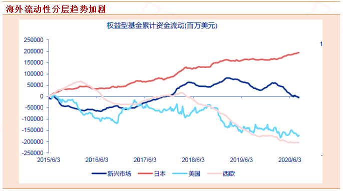 点评:随着欧美权益市场复苏,海外市场流动性差异急剧缩窄,尤其是欧洲权益市场资金流出规模开始放缓,甚至有下降迹象。美国市场流出规模本周收窄。EPFR数据显示,8月3日至8月16日其他新兴市场国家为资金开始为净流出,中国流入也开始回落,日本继续高歌猛进。由于6月中旬以来美国疫情再次爆发,南部各州重启放缓,,美国资金仍为净流出,但8月开始部分消费数据复苏明显,刺激方案也不断接近达成一致。A股方面由于前期猛涨开始回调, 前期估值开始杀跌,基本面复苏支持较弱,8月上旬北上资金净流出规模维持高位。
