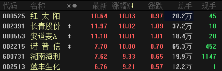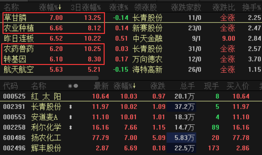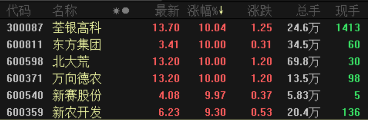 此外,农业种植板块也大幅拉升。东方集团、北大荒、万向德农、荃银高科、新赛股份纷纷涨停。苏垦农发、敦煌种业、丰乐种业涨幅均超过8%。