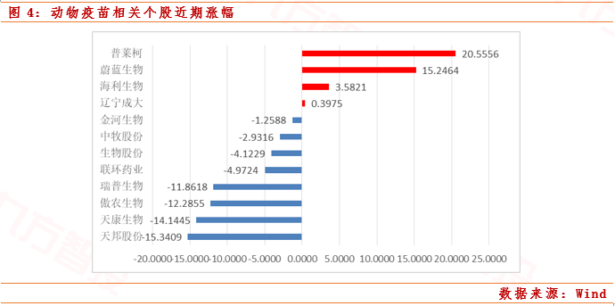 动物疫苗板块分化明显。近一个月以来,疫苗指数上涨明显,但动物疫苗板块两极分化。其中主要上涨标的为普莱柯(603356.SH)、蔚蓝生物(603739.SH)、海利生物(603718.SH)和辽宁成大(600739.SH)。跌幅前三为天邦股份(002124.SZ)、天康生物(002100.SZ)和傲农生物(603363.SH)。