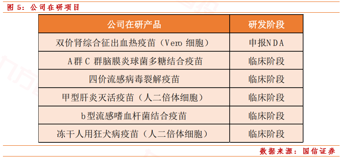 成大生物潜力明显。公司不断加快在研产品的开发与商业化,自主研发项目在有序推进。双价肾综合征出血热疫苗(Vero 细胞)处于NDA申报阶段,有望于今年获批。A群C群脑膜炎球 菌多糖结合疫苗、四价流感病毒裂解疫苗、甲型肝炎灭活疫苗(人二倍体细胞)、B型流感嗜血杆菌结合疫苗和冻干人用狂犬病疫苗(人二倍体细胞)均处于临床研究阶段。公司狂犬病疫苗市场接受度高,建议关注。