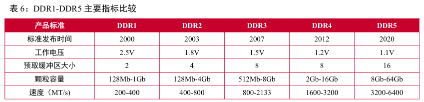 以DDR系列产品为例,目前DDR已经迭代到第5代,且每一代工作电压都较前一代有所降低,这意味着随着DDR内存技术的发展,其能耗、发热量会逐步减小,体现了DRAM低功耗的发展趋势;同时DDR第1代到第5代的最大颗粒容量和最小传输速度均实现了翻倍增长,芯片容量的扩大以及传输速率的提高,体现了DRAM高性能的发展趋势处理器升级推动DDR5渗透率提升,DDR5内存将在2024年成为主流。因为DDR5的性能提升,市场DDR5渗透率在提升。预期2025年年中渗透率可能超过60%。目前三大存储原厂海力士、美光、三星均已经扩大DDR5生产,逐步停止生产DDR4。