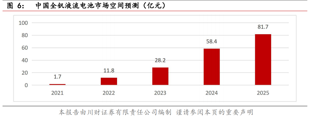 而全钒液流电池的市场空间主要来自于储能需求的增长以及自身渗透率的提升。机构预计随着技术进步以及规模化生产带来的成本降低,全钒液流电池市场空间将逐步打开,到2025年,全球全钒液流电池的市场空间将成长至20-25亿美元这一级别。考虑到我国风电光伏建设进度相较于海外国家更快,对于储能的需求也就更为迫切。合理推测在储能需求增长和液流电池渗透率提升双重效应下,2025年中国全钒液流电池市场规模将达到80亿元左右,复合增长率约60%。