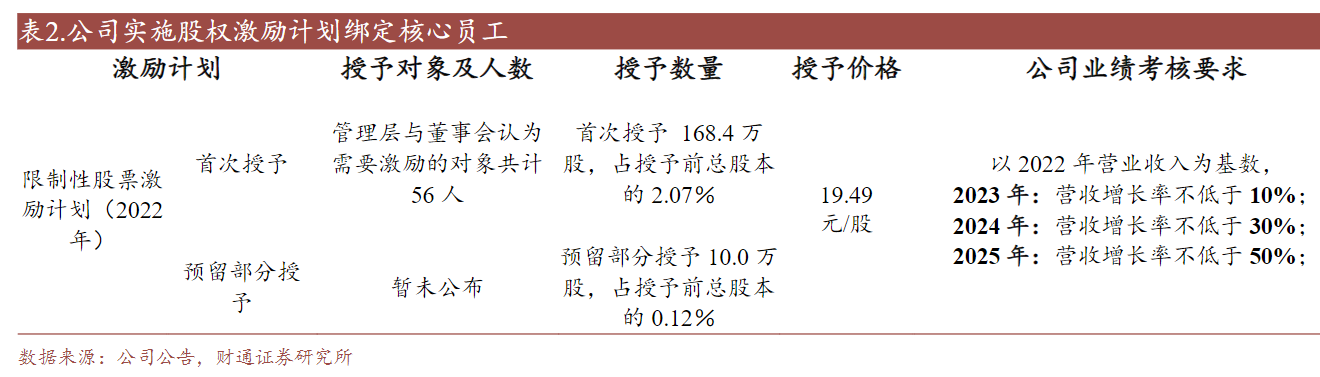 公司2022年颁布股权激励计划绑定核心人员,授予对象共计56人,包括胡能华、叶英、杨凡龙等董事和高管人员,2023-2025年业绩考核要求以2022年营收为基数,增长率分别不低于10%、30%和50%。