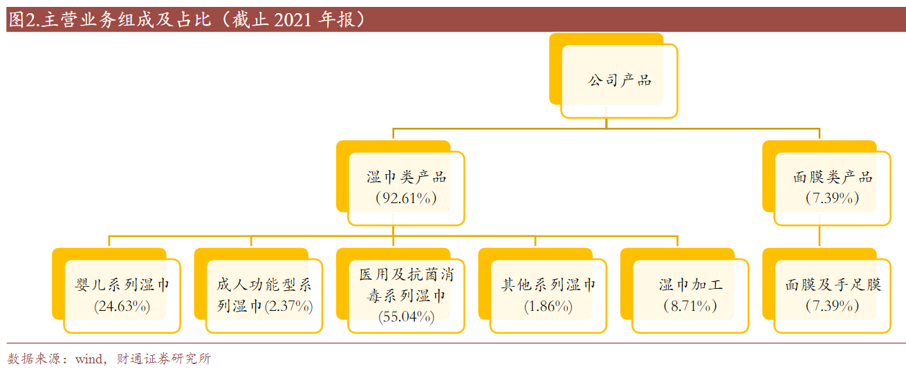 公司专注于湿巾类产品研发、生产与销售,深耕湿巾类产品二十余年,逐步成长为国内领先的湿巾制造商,在2017-2019年擦拭巾、湿巾生产商和品牌中销售额排名全国前五,湿巾出口量位居全国前列。