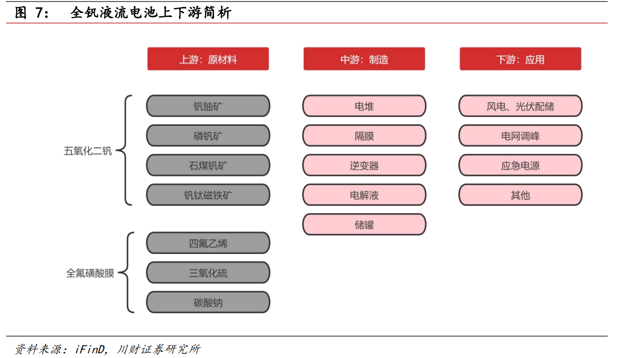 产业链来看,全钒液流电池可以简单分为上游原材料、中游制造和下游应用3个部分。目前产业变化主要集中在上游和中游。上游方面,我国钒矿储量丰富,总体上储量和产量均位于世界前列。锂电池上游锂矿一定程度上依赖海外特别是南美国家的矿物进口,钒液流电池在避免国际贸易波动的负面影响方面具备天然优势。