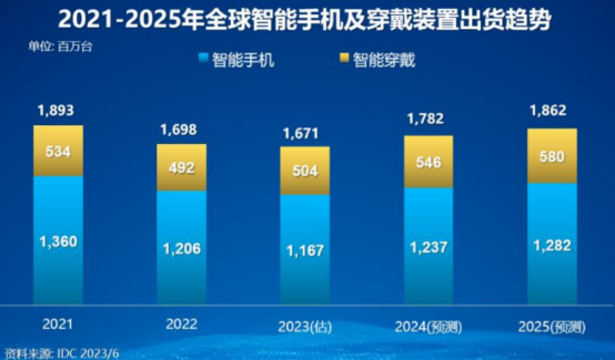6.智能终端迎新风口,高端智造显潜力。全球经济环境不佳压抑消费需求,2022-2023年全球智能手机及穿戴装置迎来衰退。然而,生成式AI应用的爆发正加速重构未来移动及智能生活,“生成式AI技术”嵌入智能手机及穿戴装置,将彻底改变人类沟通方式,成为生成式AI经济热潮的最佳展现。根据IDC预测,2024年全球智能手机及穿戴装置出货将恢复成长,预计到2025年将达到18.62亿台。