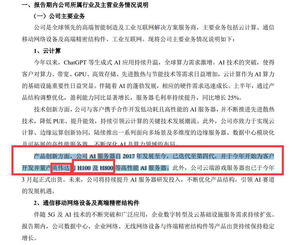 1.服务器(含AI服务器):服务器出货量稳居全球首位,官宣为英伟达代工,服务器毛利率同比增长25%。上半年,通过产品结构调整优化,盈利能力同比显著增长,服务器毛利率持续提升,同比增长25%。公司AI服务器自2017年发展至今,已迭代至第四代,并于今年开始为客户开发并量产英伟达的H100及H800等高性能AI服务器。