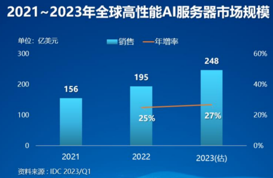 以ChatGPT为代表的生成式AI应用引发新一轮算力需求。根据IDC数据,2023年全球高性能AI服务器市场规模预计达248亿美元,年增率预计高达27%。