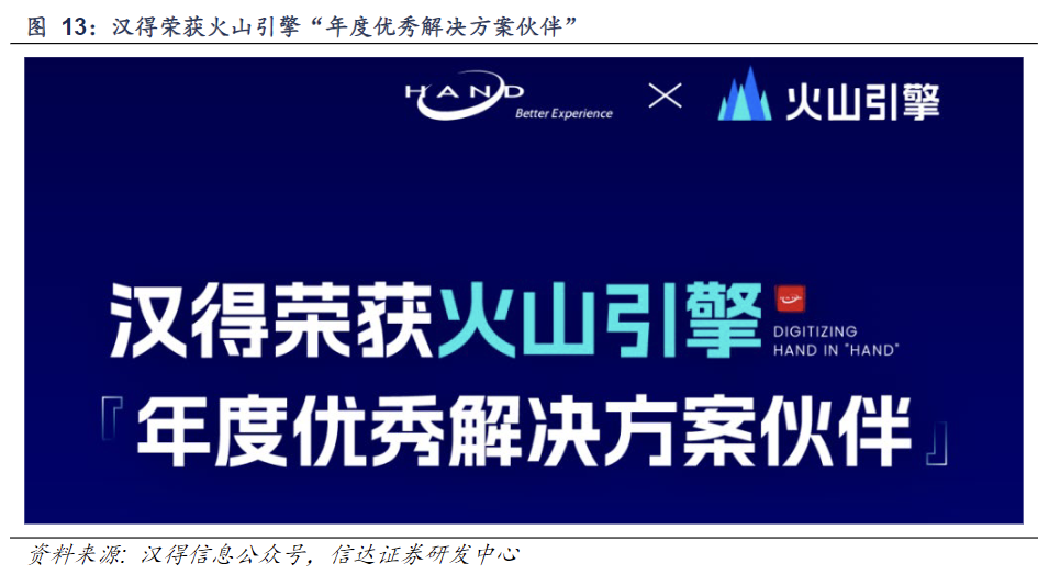 作为火山引擎生态合作伙伴,汉得信息已获得火山引擎颁发的2023年度“方案生态优秀伙伴”奖项和2022年度“年度优秀解决方案伙伴”奖项,充分体现了其和火山引擎之间的合作深度和对生态建设作出的有效贡献。我们认为,大型科技企业提供大模型的基础服务和持续迭代的能力,深耕各个行业的IT服务商借助原有客户资源和渠道优势提供高效、低成本的IT咨询和方案部署,二者相互配合将成为未来B端AI大模型落地的重要形式。