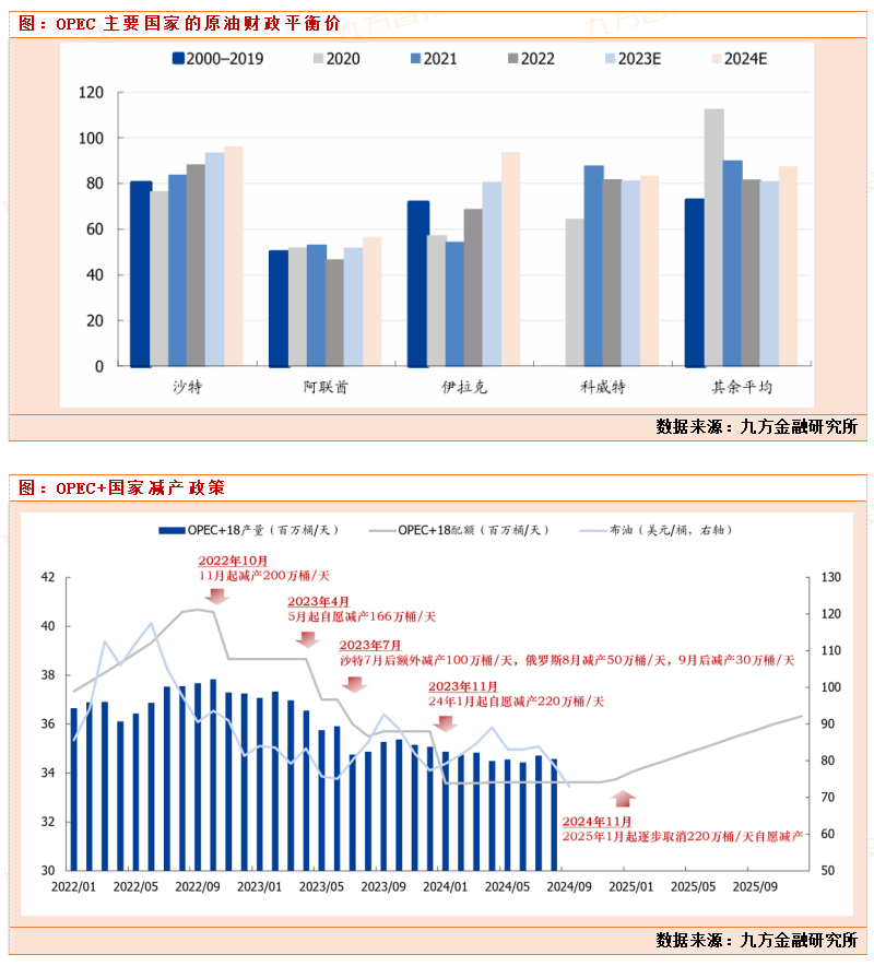 沙特在OPEC减产联盟中发挥主导作用,伊拉克等产油国的配合程度也将影响其减产。沙特、伊拉克、阿联酋、科威特是OPEC合作机制中的重要产油国。截至2024年8 月,沙特、伊拉克、阿联酋、科威特原油产量分别为901/438/330/252万桶/天,占OPEC 总产量的41%/20%/15%/11%。其中,沙特在OPEC历轮减产过程中发挥着主导作用,其余三国是否遵循减产也将对OPEC联盟一致性形成掣肘。2024年以来,沙特依然遵循减产约定,但其余三国已出现不同程度超产。因此,我们一方面认为未来OPEC整体进一步减产空间有限,仍需重点关注沙特的态度。