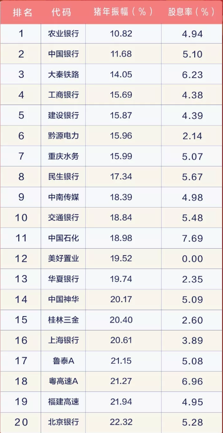 具体来看,农业银行猪年振幅为10.82%,为猪年最淡定股票;紧随其后的是中国银行,猪年振幅为11.68%;大秦铁路、工商银行、建设银行、黔源电力等11股猪年振幅也低于20%。