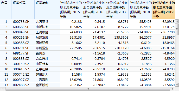 下面这张图,是连续5年经营性现金流为负的公司,按照19年三季度数据做了一下排序。感兴趣的同学可以自行验证一下,这些股票的长期走势如何?看完以后我敢保证,以后你不会买这类股票了。