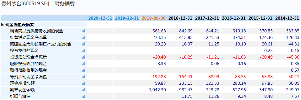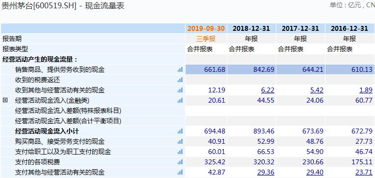 我们还是以茅台为例,大家看一下蓝色那一行,销售商品、提供劳务收到的现金。