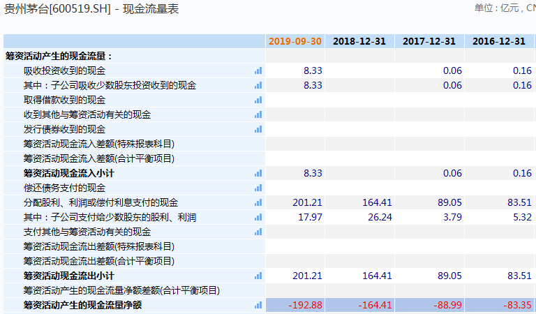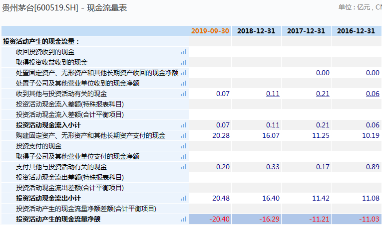 比如茅台,投资活动产生的现金流量净额就常年为负(见下图)。但这并不能简单理解为“它处在烧钱的阶段”,因为茅台每年的经营活动净现金流是几百亿,比投资活动净现金流的10亿、20亿多太多了,而且茅台的钱不是乱花的,它12-14年的投入,在16-18年看到了明显的效果。