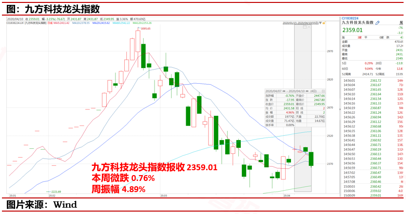 本周,A股低开高走,大盘周二跳空高开,周五高开回落涨幅收窄,沪指整体高位震荡发散收2796.63,周涨幅1.18%。股市量能延续低迷表现,总体调整格局不变,市场情绪仍较低落。科技股本周后劲不足,龙头指数走势与市场高度同步,但周五指数回吐周内全部涨幅,本周微跌0.76%。