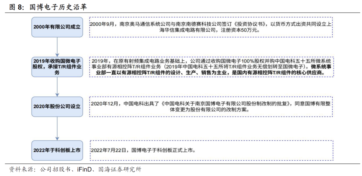 公司历史沿革和股本结构。历史沿革:2019年被注入T/R组件业务,2022年上市据公司招股书,公司于2000年正式成立,2019年国基南方以其持有的国微电子的100%股权对国博有限进行增资,在原有射频集成电路业务基础上,公司通过收购国微电子股权并购中电科五十五所微系统事业部有源相控阵T/R组件业务,公司收购有源相控阵T/R组件业务后,原待由微系统事业部履行的销售、采购业务合同仍保持合同签订主体不变,但由公司实际执行,转由中电科五十五所代销,中电科五十五所不再从事T/R组件业务。2020年公司改制为股份公司,2022年于科创板上市。
