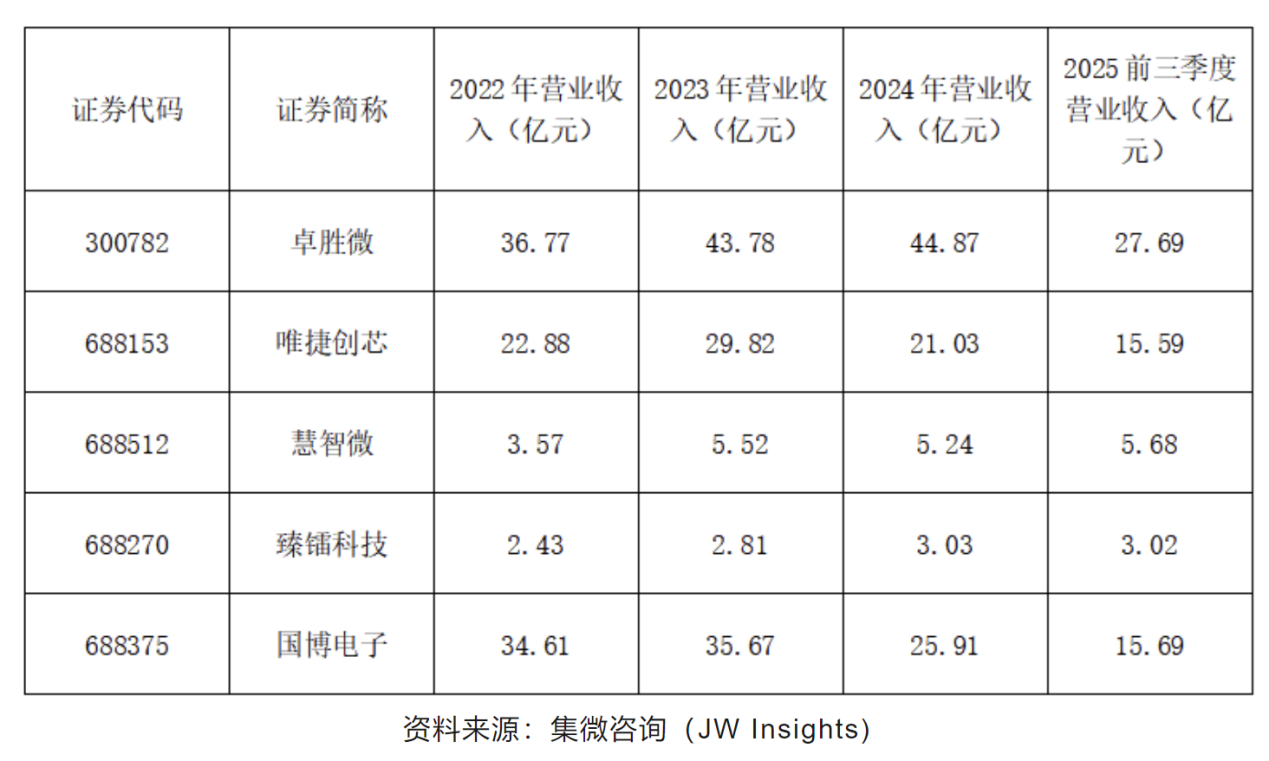 国内企业在部分领域取得进展,市场份额逐渐提升。卓胜微在射频开关领域占据全球约15%市场份额,综合国产占比约20%;国内PA厂商份额约10%。从营收规模来看,2025年上半年,卓胜微尽管同比下滑25.4%,仍以17.04亿元居首;国博电子、唯捷创芯营收均出现不同程度下滑,而慧智微、臻镭科技等规模较小的企业则实现显著增长,增幅分别达39.97%和73.64%,显示出中小企业正在细分领域快速崛起。