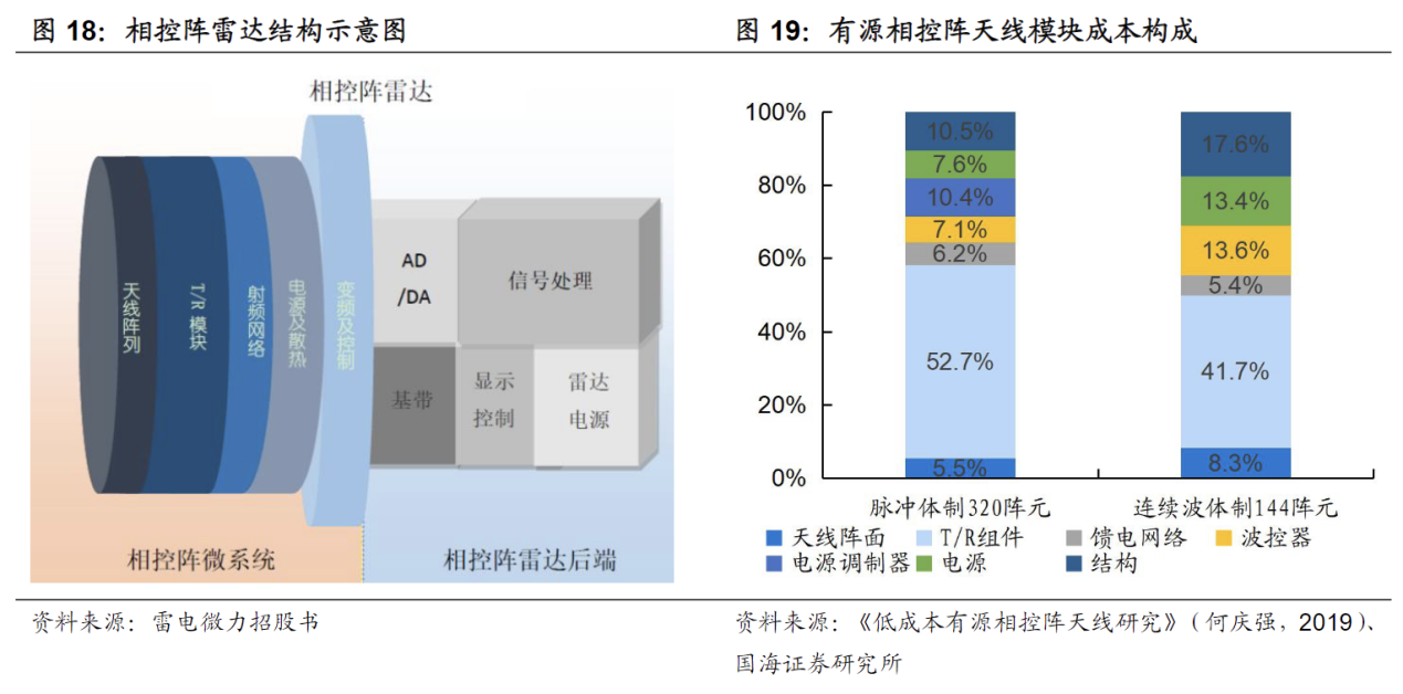 T/R组件是有源相控阵雷达的核心器件,其成本占雷达整机总成本比例约为28%-40%。相控阵雷达包括天线微系统和后端组件,据公司招股书,一部有源相控阵雷达天线系统成本占雷达总成本的70%-80%。据《低成本有源相控阵天线研究》(何庆强,2019),有源相控阵雷达天线系统主要包括天线阵面、TR组件、馈电网络、波控器、电源(含信号调制器)以及结构件(含散热装置)等,其中T/R组件在有源相控阵天线模块中的成本占比在40%-50%。根据上述比例测算,T/R组件成本占雷达总成本比例约28%-40%。