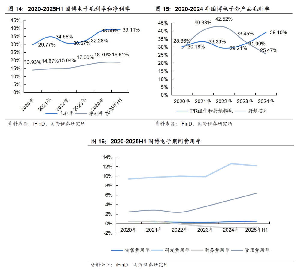 公司产品结构相应调整。分产品看,T/R组件和射频模块业务毛利率上升主要因为公司成本管控和自研芯片比例提高,射频芯片业务毛利率先升后降主要因为公司战略性调整射频放大类芯片产品结构、增加新产品的销售,导致前期毛利率增加,后续新产品成熟量产、单价下降,毛利率又逐渐下降。未来随着公司自研芯片的应用比例不断提升,原材料成本有望进一步下降,有助于继续提升综合毛利率水平。从期间费用率来看,2020-2024年公司研发费用率和管理费用率呈增长趋势,研发费用水平的提高体现公司对新产品、新技术研发的重视;销售费用率和财务费用率相对稳定在较低水平。