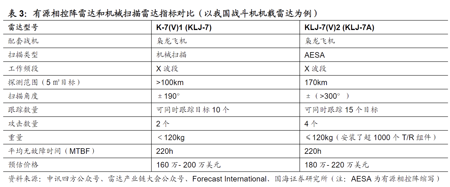 相较于机械扫描雷达,AESA具有扫描速度快、多功能、多目标跟踪、可靠性高、抗干扰能力强等优势;相较于PESA,AESA具有探测距离明显增大、效率及可靠性更高、截获概率低等优势。因此有源相控阵雷达逐渐替代机械扫描雷达、无源相控阵雷达成为主流。