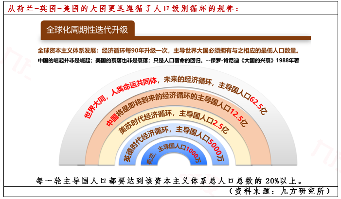 从荷兰-英国-美国的大国更迭遵循了人口级别循环的规律。每一轮主导国人口都要达到该资本主义体系总人口总数的20%以上。