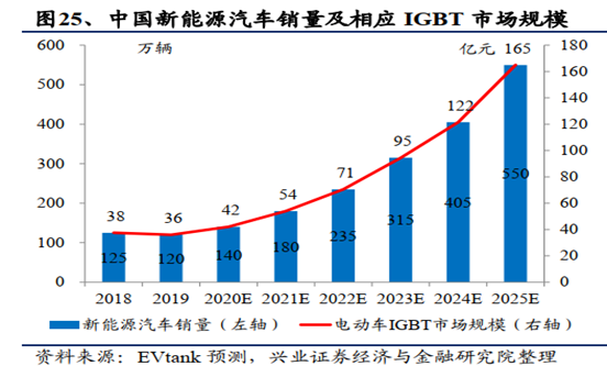2019年中国新能源汽车IGBT市场规模为36亿元,伴随2025年国家政策要求新能源汽车销售占比达到25%,将会极大剌激对IGBT的需求,预计未来五年年均增速保持30%,2025年中国新能源汽车电驱IGBT市场规模可达165亿元。