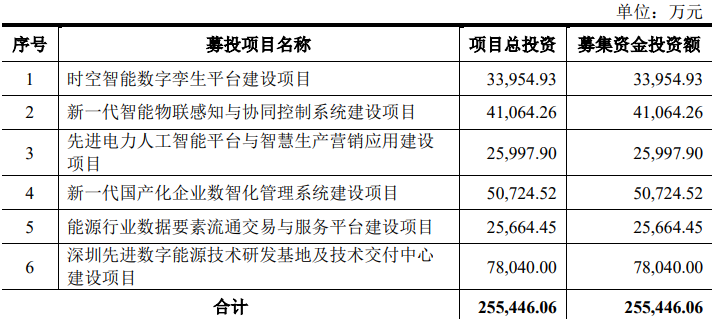 本次IPO募集资金将全部投向公司主业,主要集中于先进产品、前沿技术研发领域,具体包括“时空智能数字孪生平台建设项目”、“新一代智能物联感知与协同控制系统建设项目”、“先进电力人工智能平台与智慧生产营销应用建设项目”、“新一代国产化企业数智化管理系统建设项目”、“能源行业数据要素流通交易与服务平台建设项目”、“深圳先进数字能源技术研发基地及技术交付中心建设项目”六个项目。