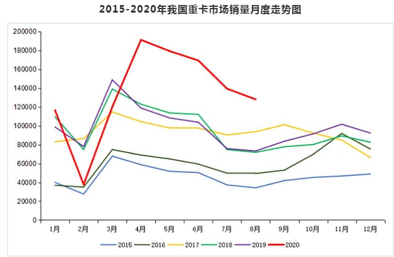 12.8万辆这个数据,创造了重卡行业8月份销量的新高,比上一个历史纪录——2017年8月9.37万辆的销量水平多出了3.4万辆。