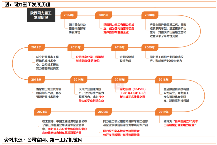 成立于2005年初的同力重工一家专业生产非公路用车的高新技术企业。公司深耕非公路运输设备领域,不仅是国内第一批研发、生产非公路宽体自卸车的专业化企业,也是国内该细分行业领域的开创者和行业标准制定者。