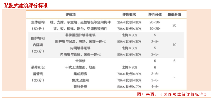 我国装配式建筑标准规范体系越发完善。2018 年《装配式建筑评价标准》的正式实施,建立了对装配式建筑评价的统一量化标准。该标准提出装配式建筑应同时满足以下要求: