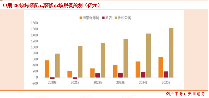 根据天风证券预测,中期2B领域的装配式装修市场规模在2025年达到2482亿元,2020-2025年复合增速为14%。其中,国家保障房、酒店、长租公寓分别为663亿元、186亿元、1632亿元,长租公寓占比高达66%。