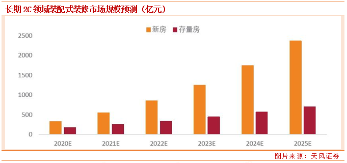 目前C 端领域装配式装修渗透率低,大多应用于高档住宅,其装修成本占比小,对于价格不太敏感。不过随着技术水平的进步、规模效益的形成、成本的逐渐下降,长期来看C 端市场潜力大。我们分别对新房市场和存量房市场进行测算,预计2025 年2C 领域装配式装修市场规模有望达到3062 亿元,2020-2025 年复合增速为38%。其中,新房市场2360 亿元,存量房市场702 亿元,新房市场占比达77%。