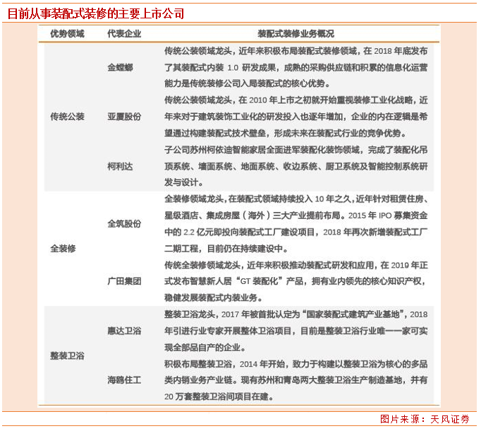 在政策鼓励下,装配式装修成为新风口,市场参与者开始加速布局。目前装配式装修相关上市公司中以传统公装龙头金螳螂、亚厦股份、柯利达,全装修龙头全筑股份、广田集团,整装卫浴龙头惠达卫浴、海鸥住工为代表。