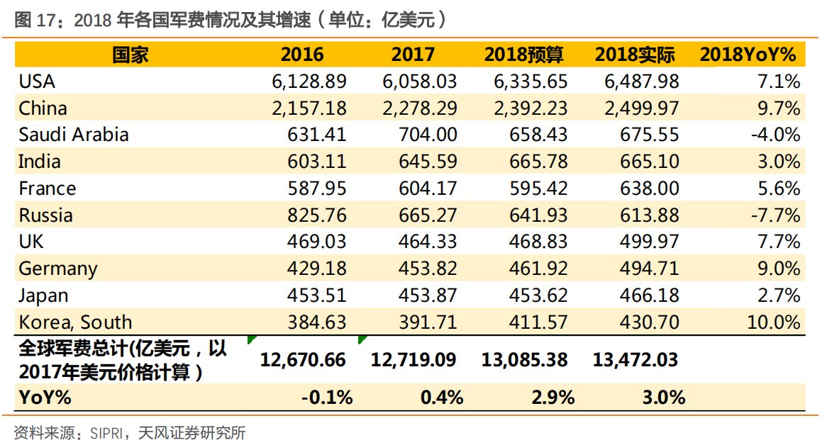 航空发动机在航空装备中占到很大的价值量,整体看,发动机全寿命周期的费用,占整个飞机全寿命周期费用的30%左右。航发动力作为同时具备发动机制造、发动机维护能力的寡头企业之一,其所在的产业链位置使其在我国军航发动机中占到了不可忽视的作用。一个国家的军费越高、同时花费在航空装备上的费用比例越高,那么可以预计的是,公司所面临的下游需求就越多,市场空间也就越来越广阔。