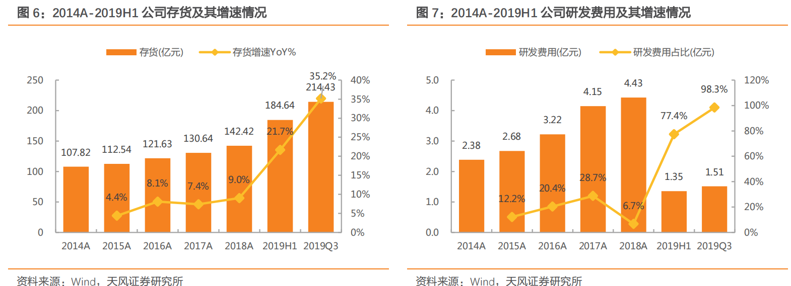 作为我国军民航发动机及其配件的稀缺资产,公司整体维持了稳健的业绩趋势,同时积极实施主业聚焦战略。2019年前三季度公司增速略有放缓,存货、研发费用等出现显著的拉升,我们认为,两方面表面上冲突表明,公司正处在新老产品迭代的过渡期,预计未来2-3年望迎业绩释放。从存货端来看,2019年前三季度相比期初规模增长了超过70亿元,我们认为主要是重点型号产品交付延后所致,预计全年业绩放量可期。从研发费用及其占收入比来看,公司2014年至今在研发领域的投入持续加大,针对产品核心技术问题实行重点攻破。